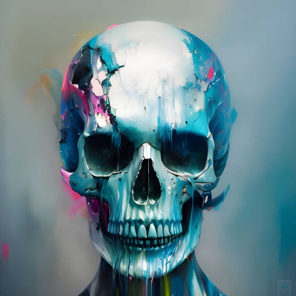 A photorealistic portrait of an ice skull with ultra-fine details, rendered with dramatic lighting and deep colors. This 3D image features a blend of oil painting techniques and digital art.