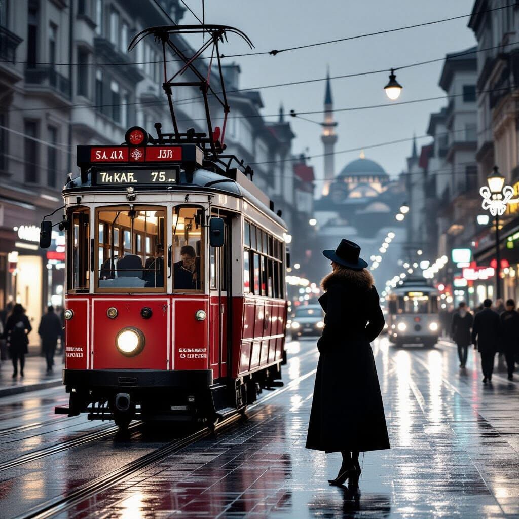 This image shows a woman in 1950s Istanbul near a red tram. The black and white photograph evokes street photography of the era, with atmospheric lighting and classic composition.