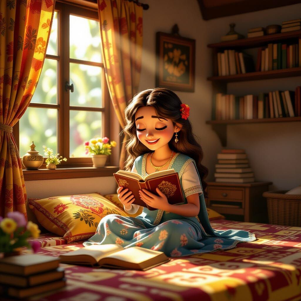 This image shows a young woman waking in a vibrantly decorated room with soft light and jasmine flowers. Golden sunbeams illuminate her as she smiles, with medical books nearby. Rendered in a hyper-realistic, cinematic 3D style.