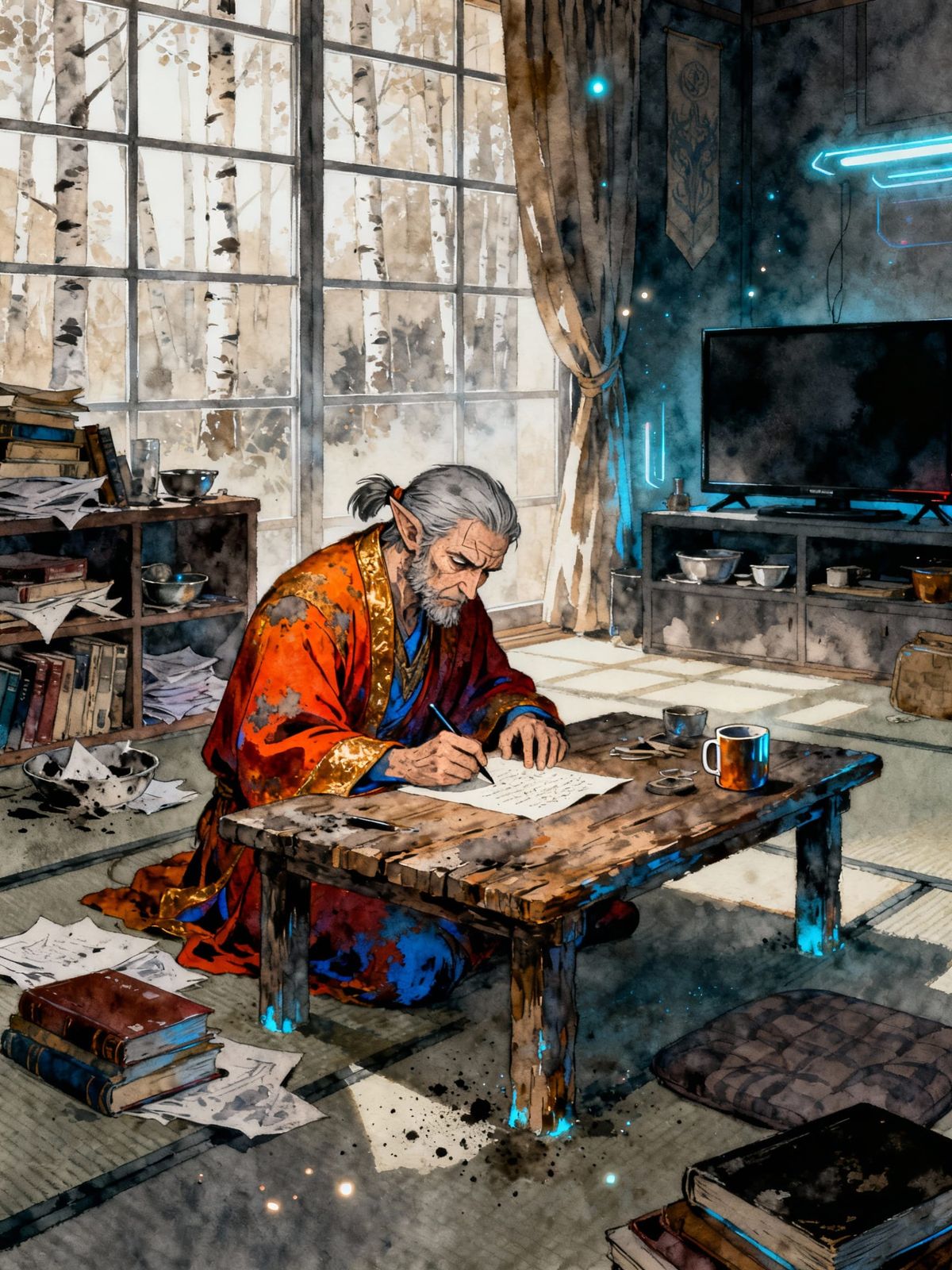 zoomed out, long view, storytelling, Dark comic style, Water color High Gothic, Ethereal, Otherworldly, Hyperdetailed, sublime, detailed, Majestic (dramatic, cinematic:1.2), side view, movie shot of (60 yo:1.2) (1 highborn elf:1.3) (sitting:1.2) at a (rough wooden:1.1) (desk:1.2), (writing:1.27) something ...