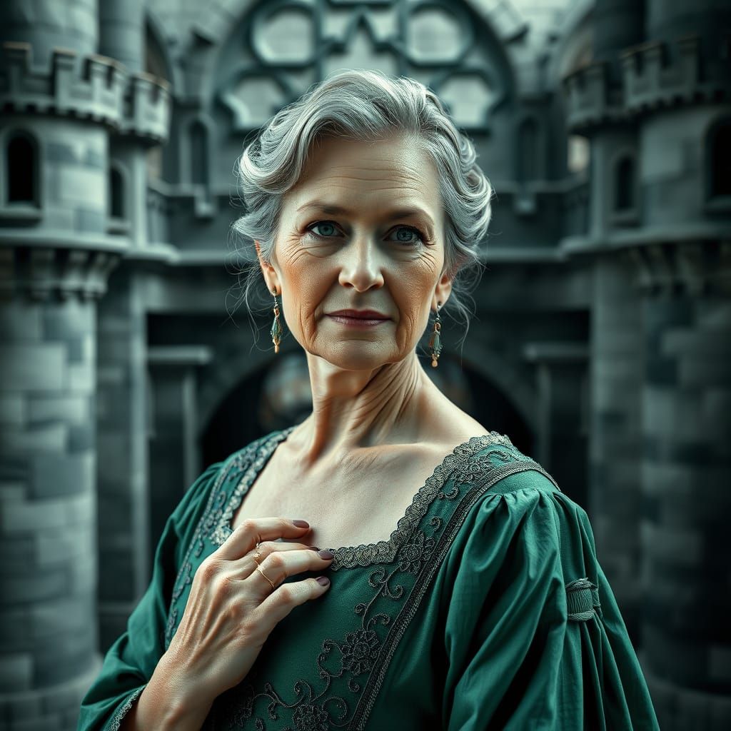 A striking picture of a middle-aged woman in a green medieval dress, set against a castle backdrop with quantum elements. Soft focus monochrome photography with papercraft details.