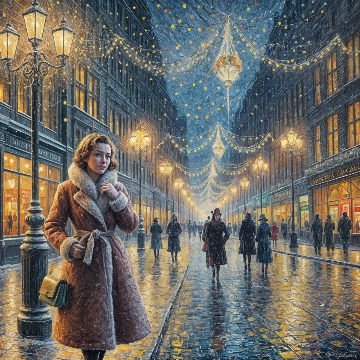 A scene unfolds on a cold winter night in the 1950s in the streets of Manchester. In the picture foreground, a charming Caucasian woman walks beneath Christmas lights, fondly looking upon the cheerful decorations. The style of this image is inspired by Neo-impressionism, characterised by vibrant colours, ...