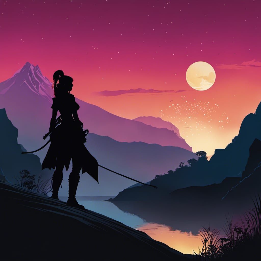 A striking picture of a silhouetted fantasy heroine against a cool-toned matte backdrop. The image features an iridescent textured background and a looming figure in the distance.
