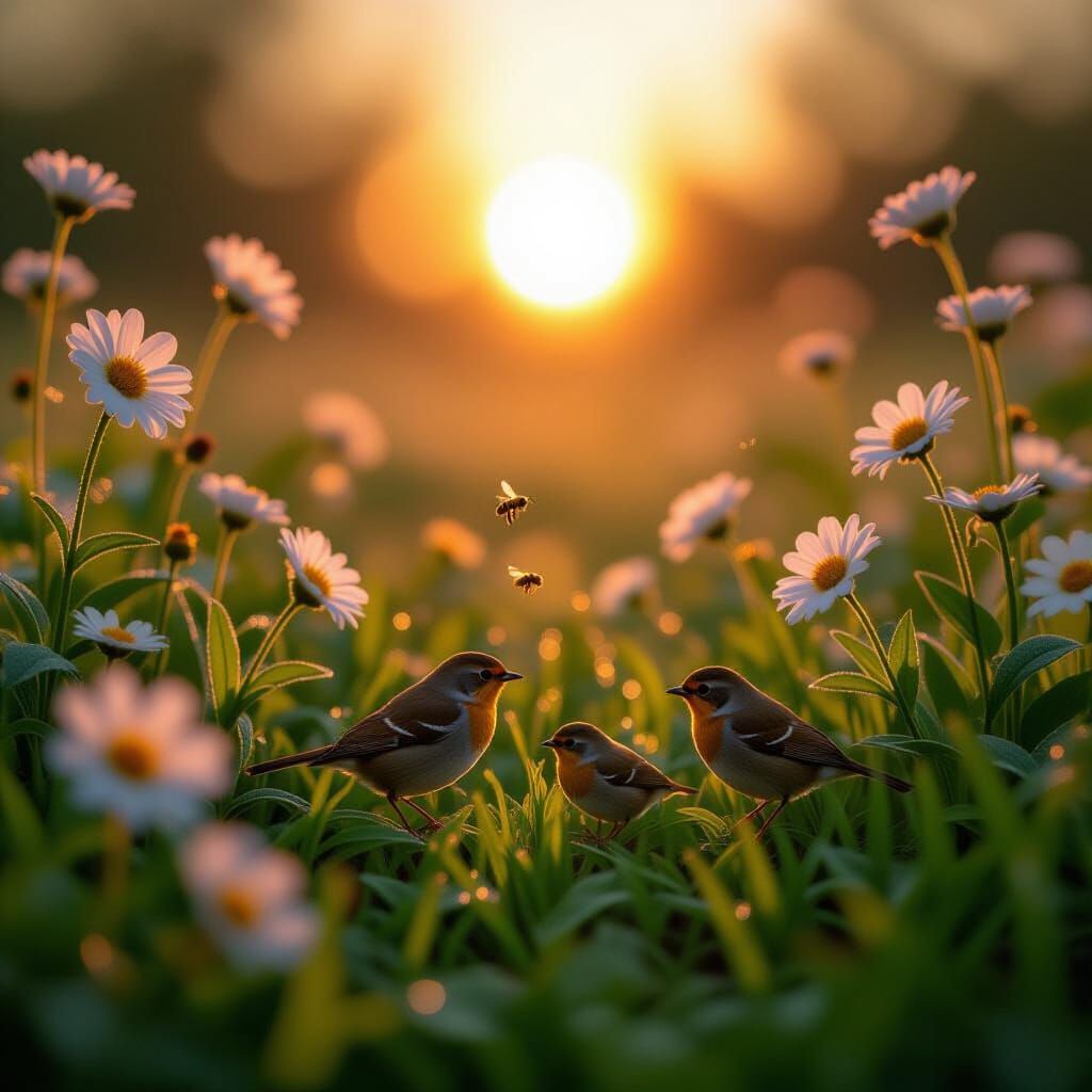 This hyper-realistic image captures a lush flower garden at sunrise, with dramatic shadows and dew-covered spider webs. Golden light illuminates foraging robins and early bees, creating an ethereal morning scene.