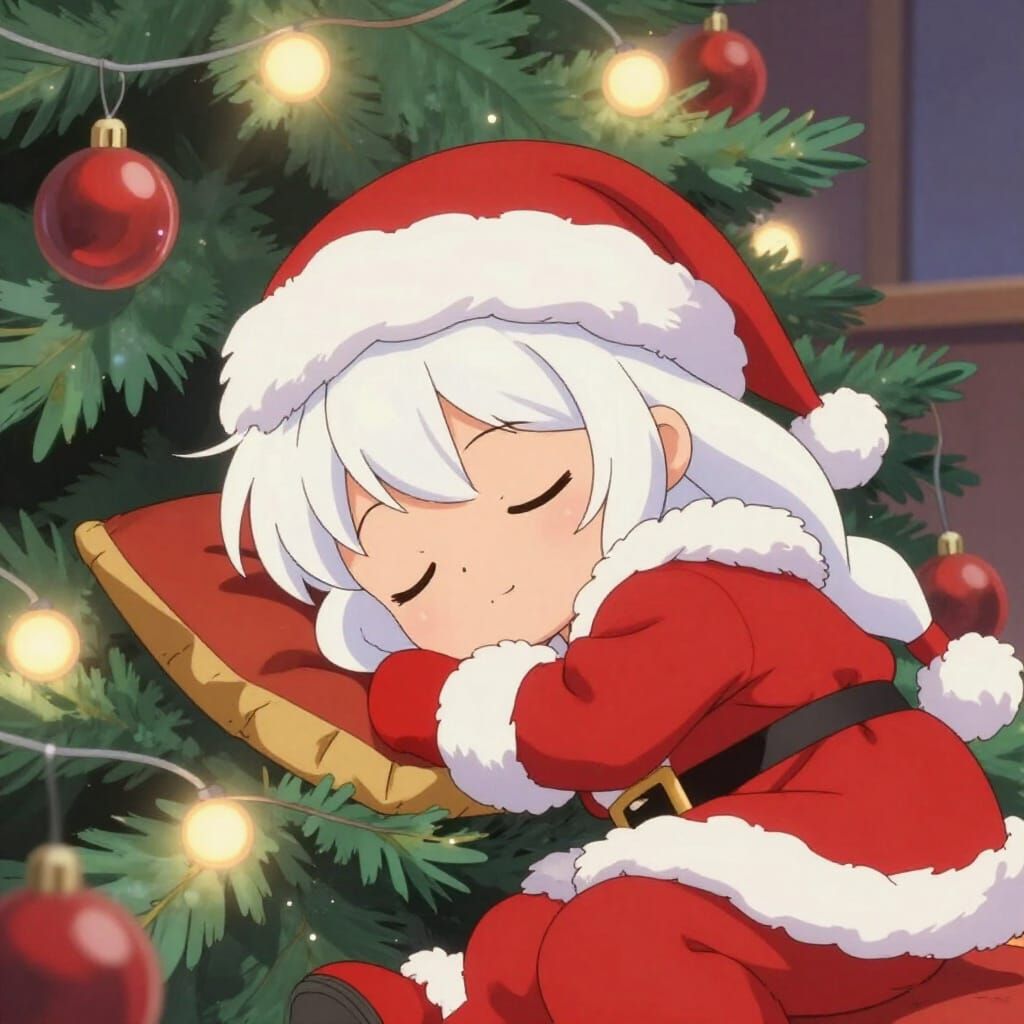 This image depicts an anime chibi girl with snowy hair in a Santa outfit, sleeping under a decorated Christmas tree. The scene features warm, soft light and a dreamy, 90s anime art style.