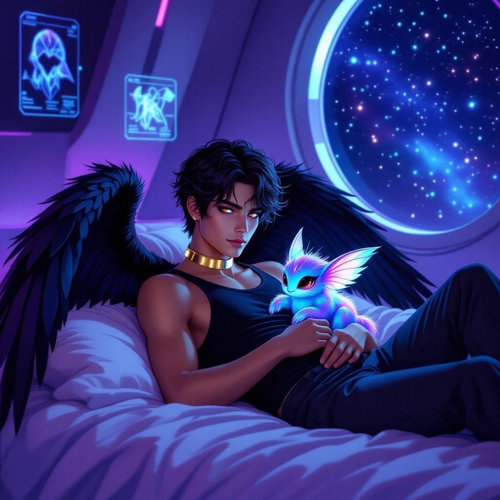 Really interesting and impressive artwork! I like here the combination of the gorgeous young man with black wings, the iridescent alien creature with the sci-fi vibe