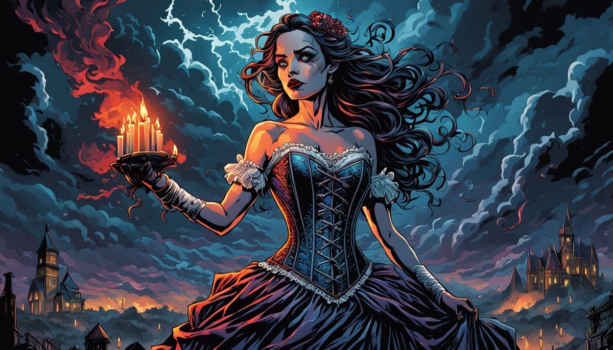 A comic-style image of a bride in a colorful corset against a dramatic, stormy backdrop. The scene features swirling fog and dark candles, illuminated with triadic colors.