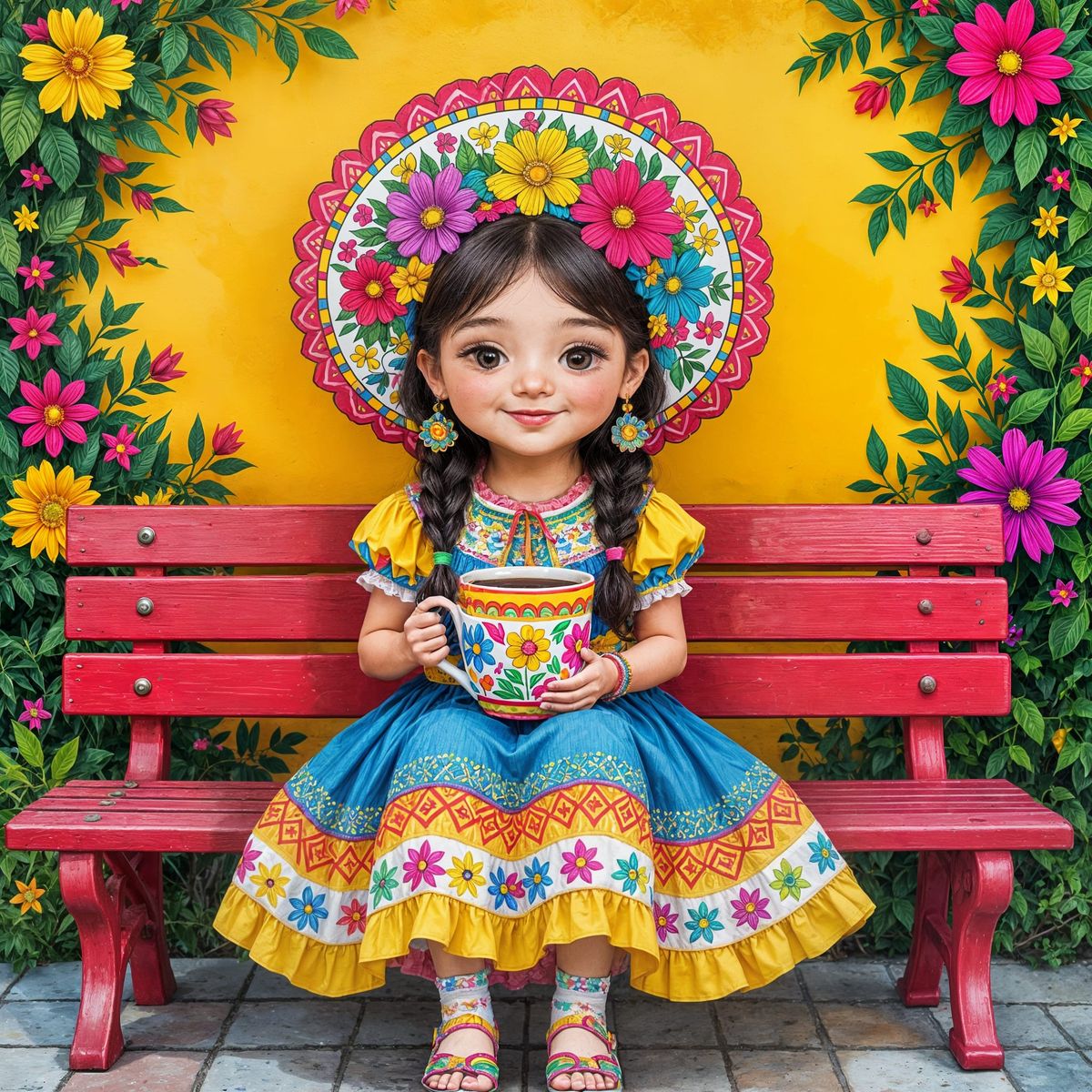 A vibrant illustration of a girl in a colorful Mexican dress and bonnet, holding a Talavera pottery mug. The art style resembles detailed coloring for adults, with bright, vivid hues.