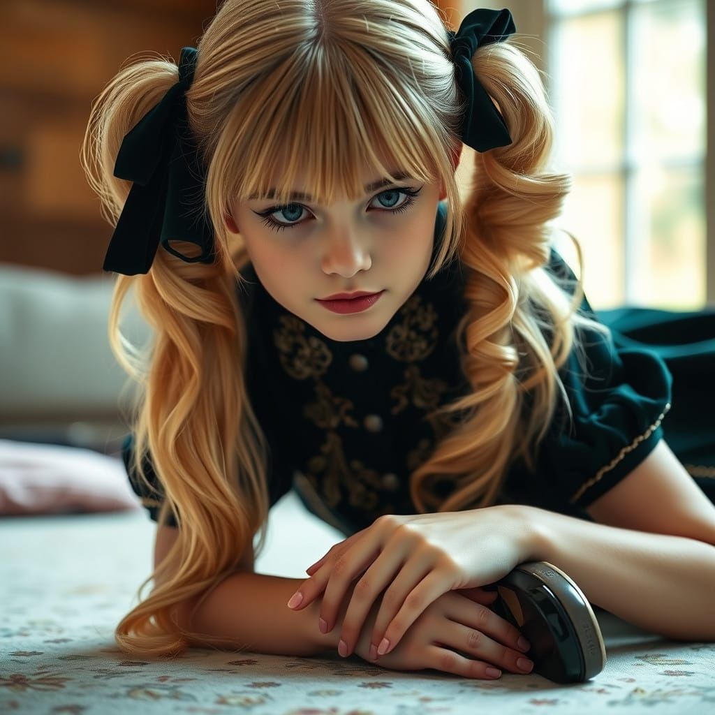 This image captures a youthful crossdressing individual in a velvet Peter Pan dress with blonde pigtails. Shot with a shallow depth of field, it features a dreamy bokeh effect and warm, natural light.