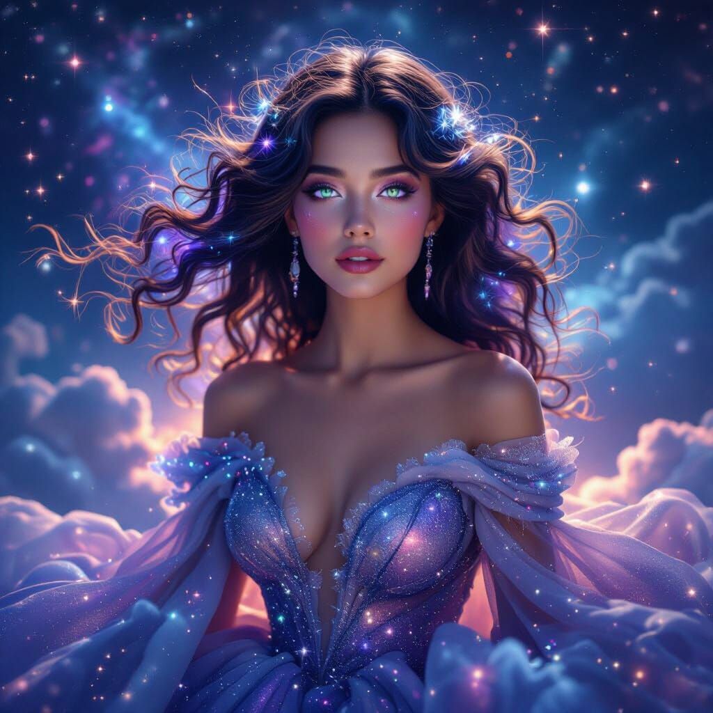 Imagine a celestial muse with hair like swirling nebulae and eyes that mirror distant galaxies, adorned in a gown woven from starlight and cosmic dust, her presence radiating an ethereal glow. She floats serenely amidst a canvas of celestial wonders, surrounded by shimmering constellations and vibrant ...