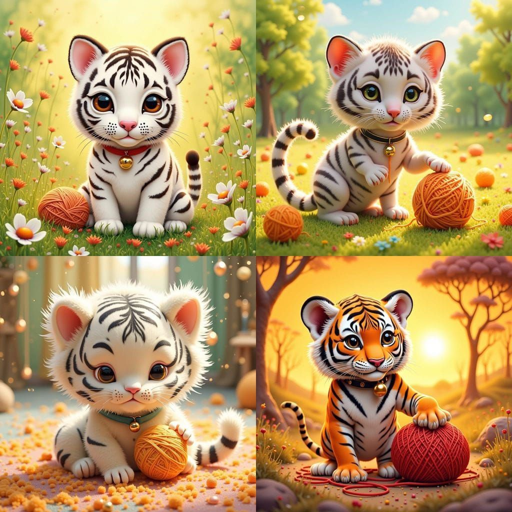 A charming image of a tiger cub showing both albino and melanistic traits. The cub is depicted in a playful fight, rendered as soft and cute digital art.