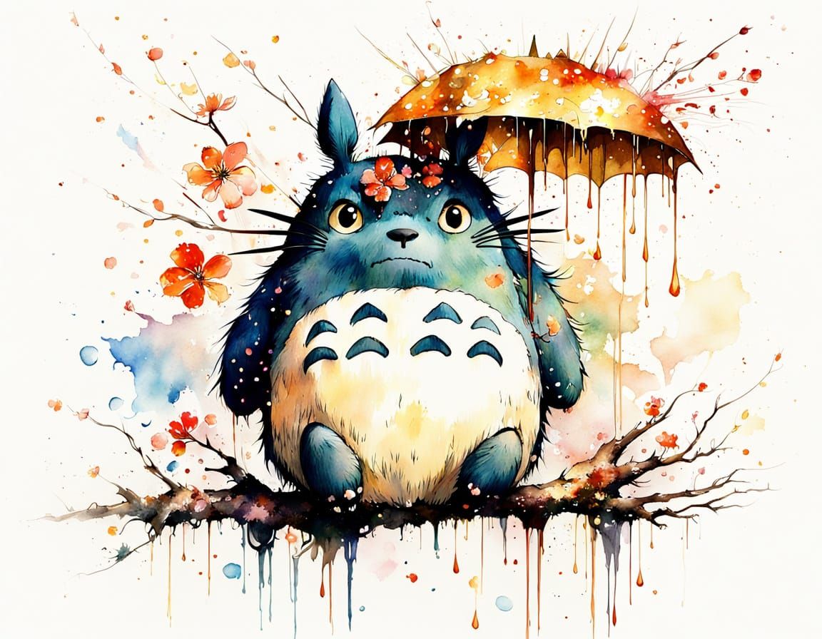This image depicts a vibrant, watercolor-inspired scene of Totoro amidst a cascade of glowing sakura petals, set against a backdrop of copper and gold hues, with splashes of wet paint and particles dancing around a fiery center.