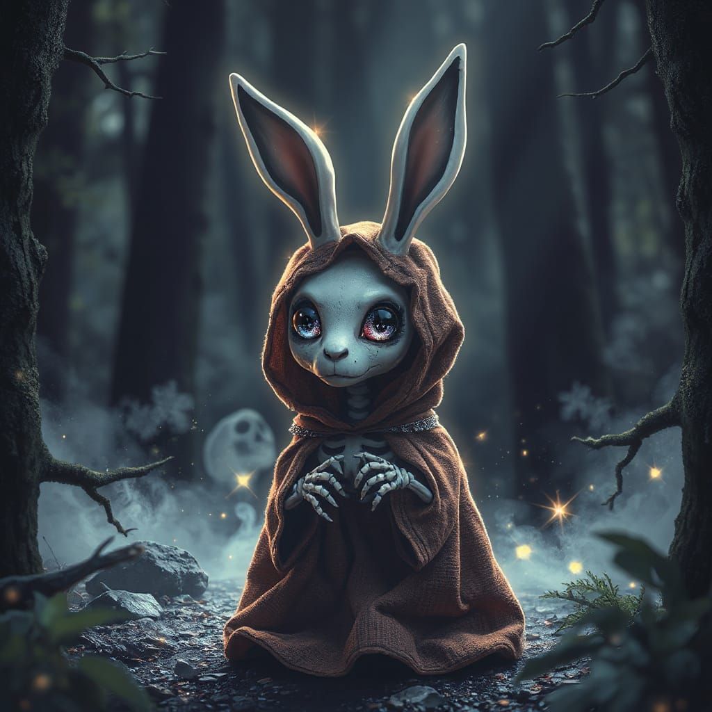 This enchanting image depicts a mystical, skeleton creature with big sparkling eyes and rabbit ears, surrounded by an otherworldly forest, blending creepy undertones with a touch of cute, whimsical charm.