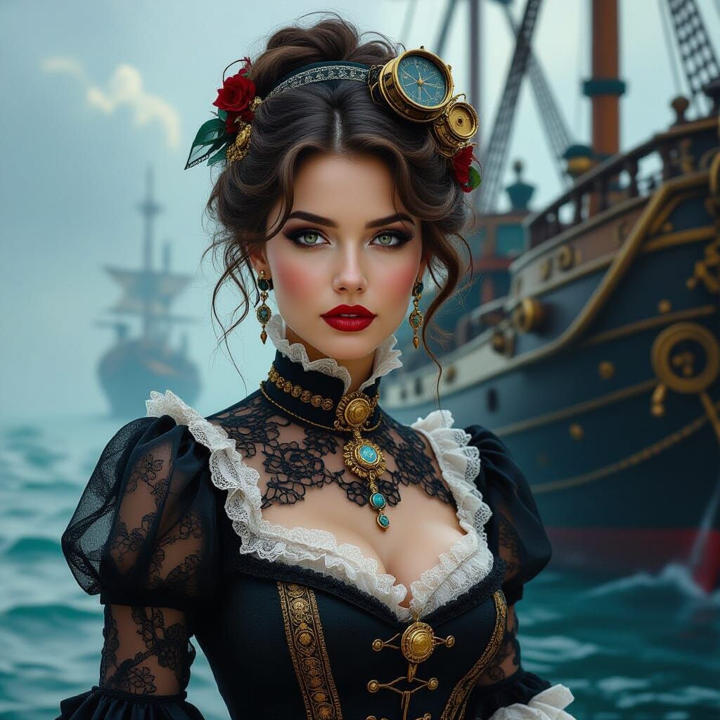 This image shows a steampunk woman in Victorian lace with a steampunk ship. The digital matte painting creates a dramatic and atmospheric scene with intricate details.