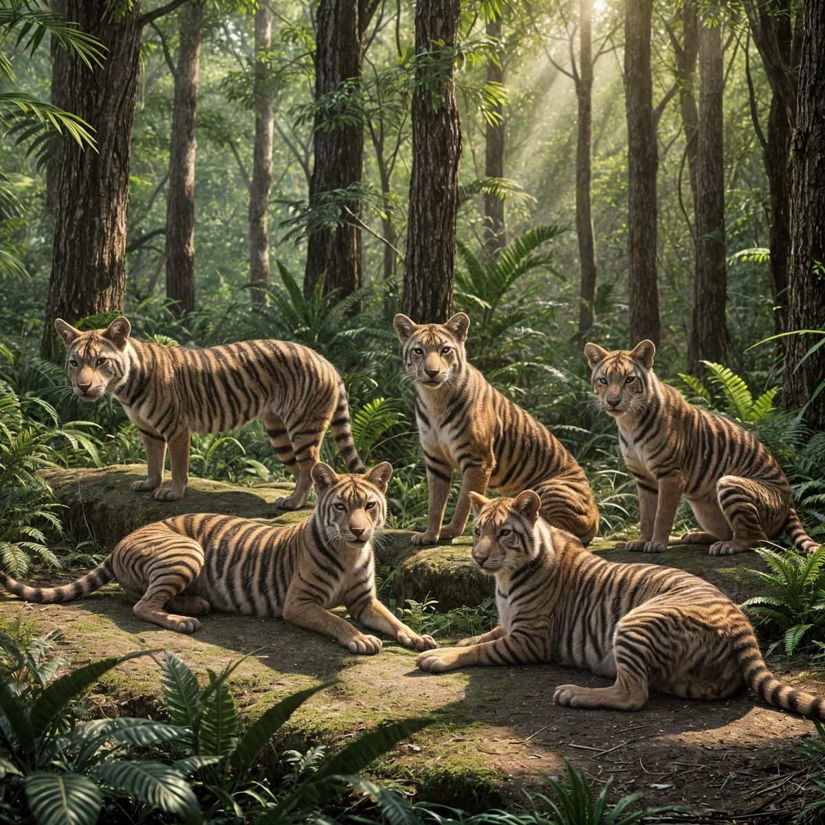 This image shows a family of Tasmanian tigers resting peacefully in a sun-drenched forest. The cinematic lighting and vivid colors enhance the intricate details of this amazingly realistic scene, rendered in 8k resolution.
