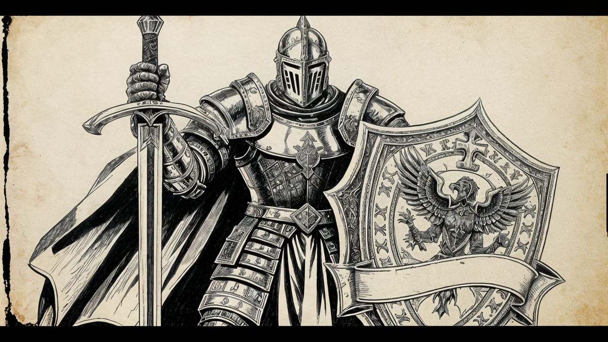 A detailed ink illustration of a knight in full plate armor. The artwork features intricate engravings, bold linework and cross-hatching to create shadows, in the style of a medieval manuscript.