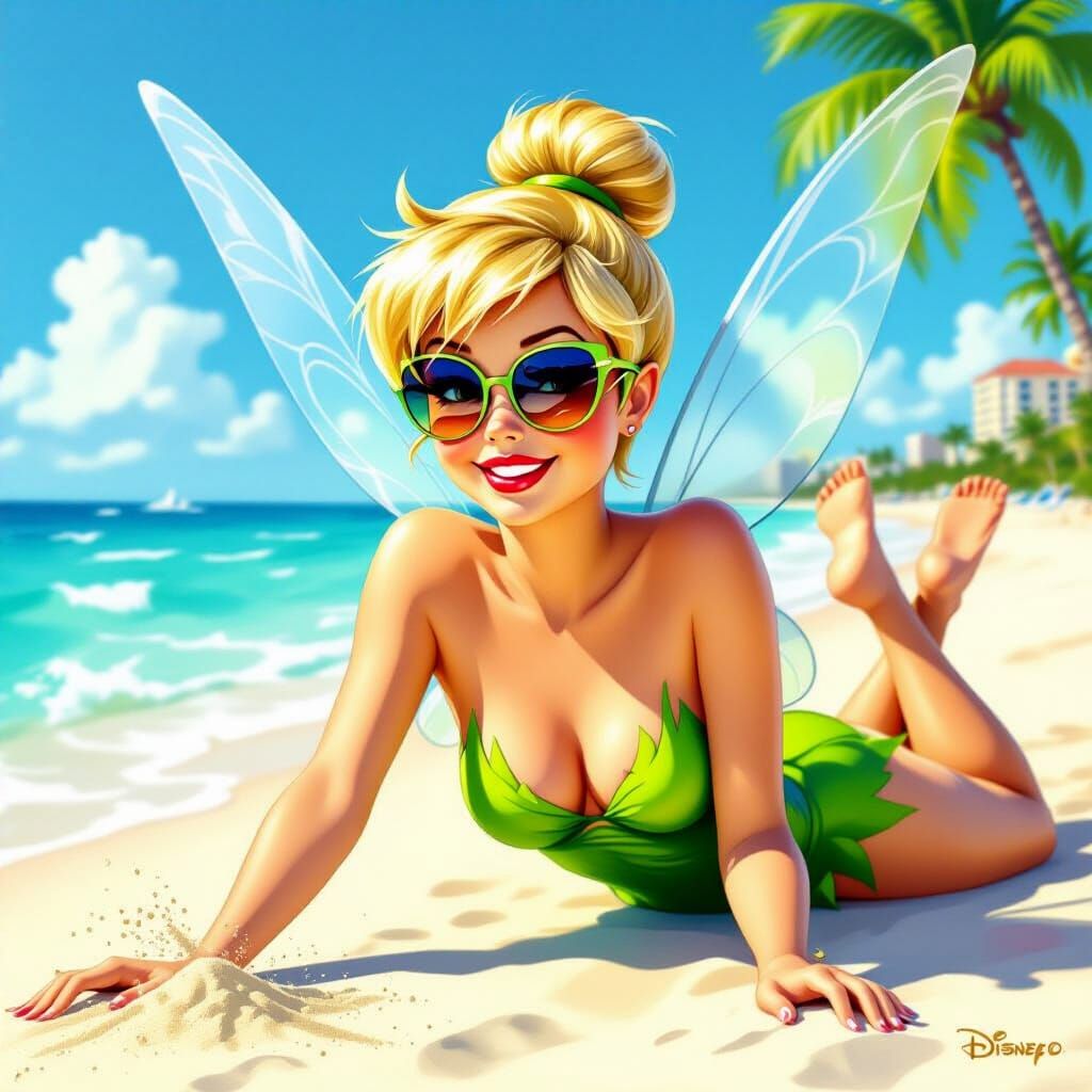 This image shows Tinker Bell relaxing on Miami Beach, wearing sunglasses and playfully sprinkling sand. The artwork is rendered in a vibrant airbrush style.