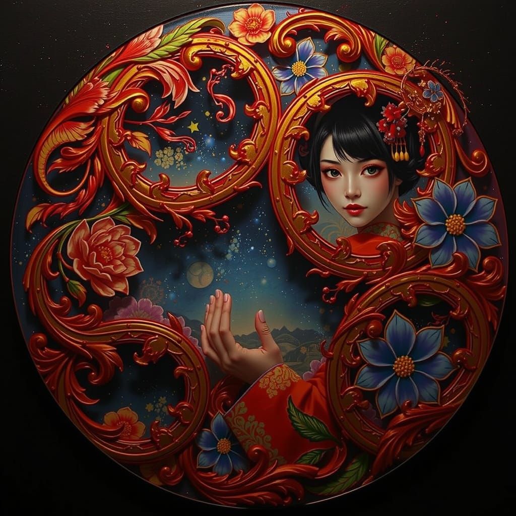 This hyperrealistic image features a geisha with dark hair and green eyes, adorned in a vibrant, multi-colored dress, gazing at her mirrored reflection. A cosmic backdrop and floral pond add intricate detail.