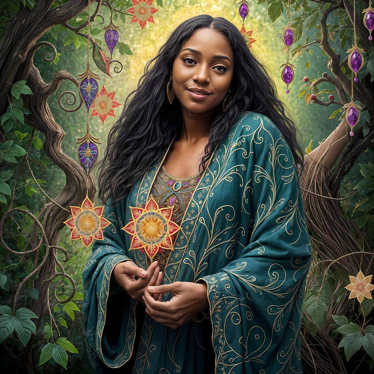 Easily generate your own stunning, jewel-toned tree images with our free AI image generator, featuring fractal fruits and rich, dark chocolate skin tones.