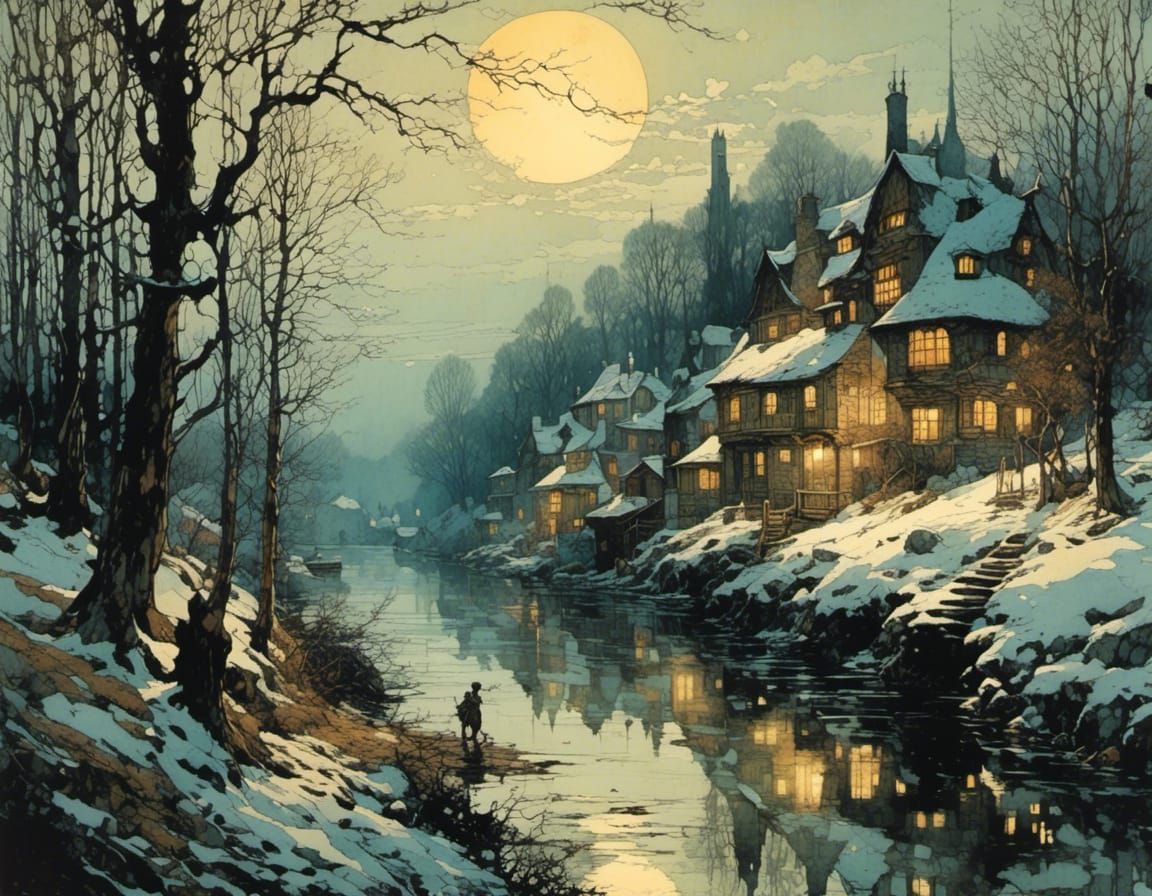 This image depicts a serene landscape at dawn. It captures the tranquil transition from darkness to light in an impressionistic style, reminiscent of classic landscape paintings.