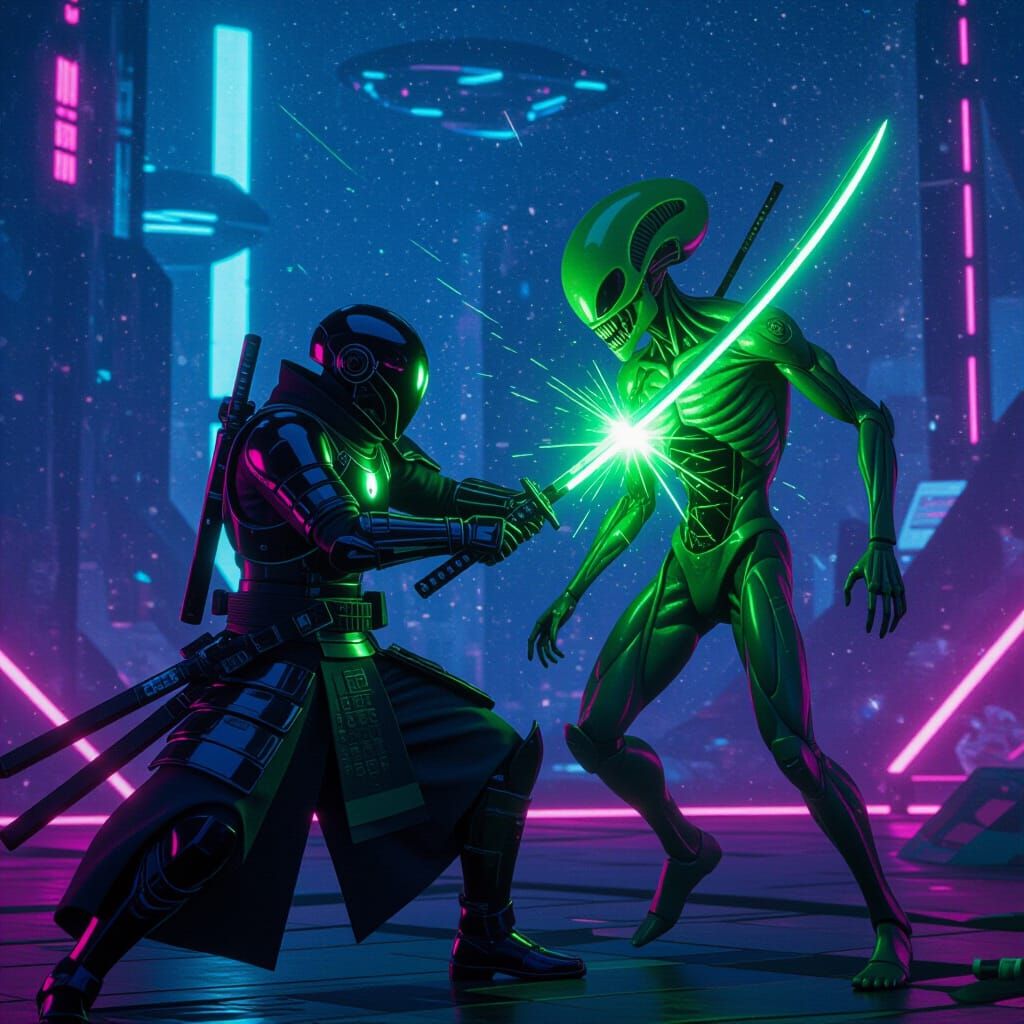 A futuristic space samurai slices a green space alien in half with his hi-tech katana