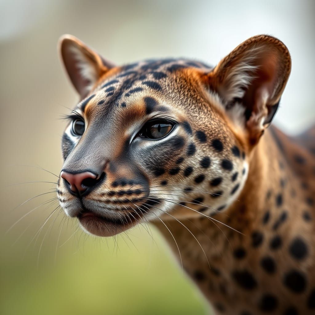 A striking close-up portrait of a jaguarundi's face, set against a blurred natural background, showcasing its unique facial features and intricate fur texture.