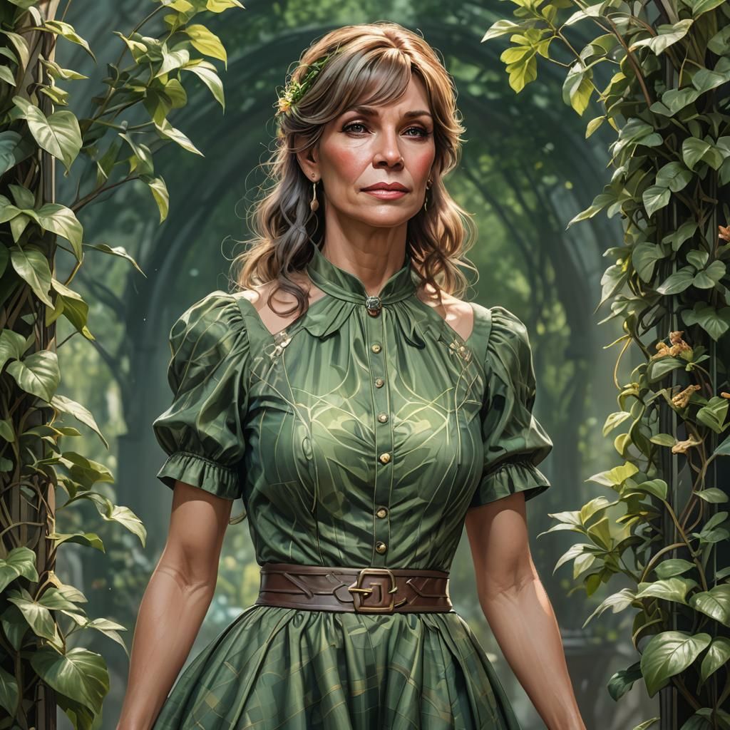 This portrait showcases a beautiful transwoman in a vibrant pastel green summer dress, highlighting her curvy figure in a striking 8k concept art piece with dynamic lighting and intricate details, blending Art Nouveau and futuristic elements.