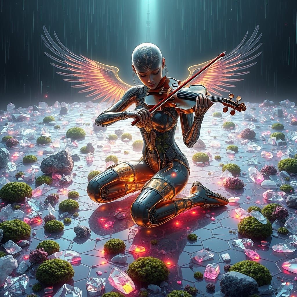 This image depicts a cyberpunk scene where a cyborg violinist kneels on a crystalline pathway of shattered lab-grown diamond, surrounded by bioluminescent AI moss and a Metatron's Cube crystal violin, with a pulsing geode projecting holograms of Tokyo's cherry blossoms.