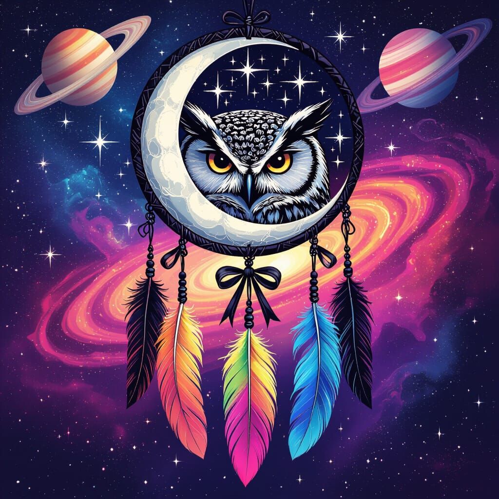 A striking picture of a detailed dreamcatcher featuring a crescent moon. Inside, a high-contrast owl portrait is surrounded by stars and a vibrant galaxy. Oversized rainbow feathers hang below in this digital painting.