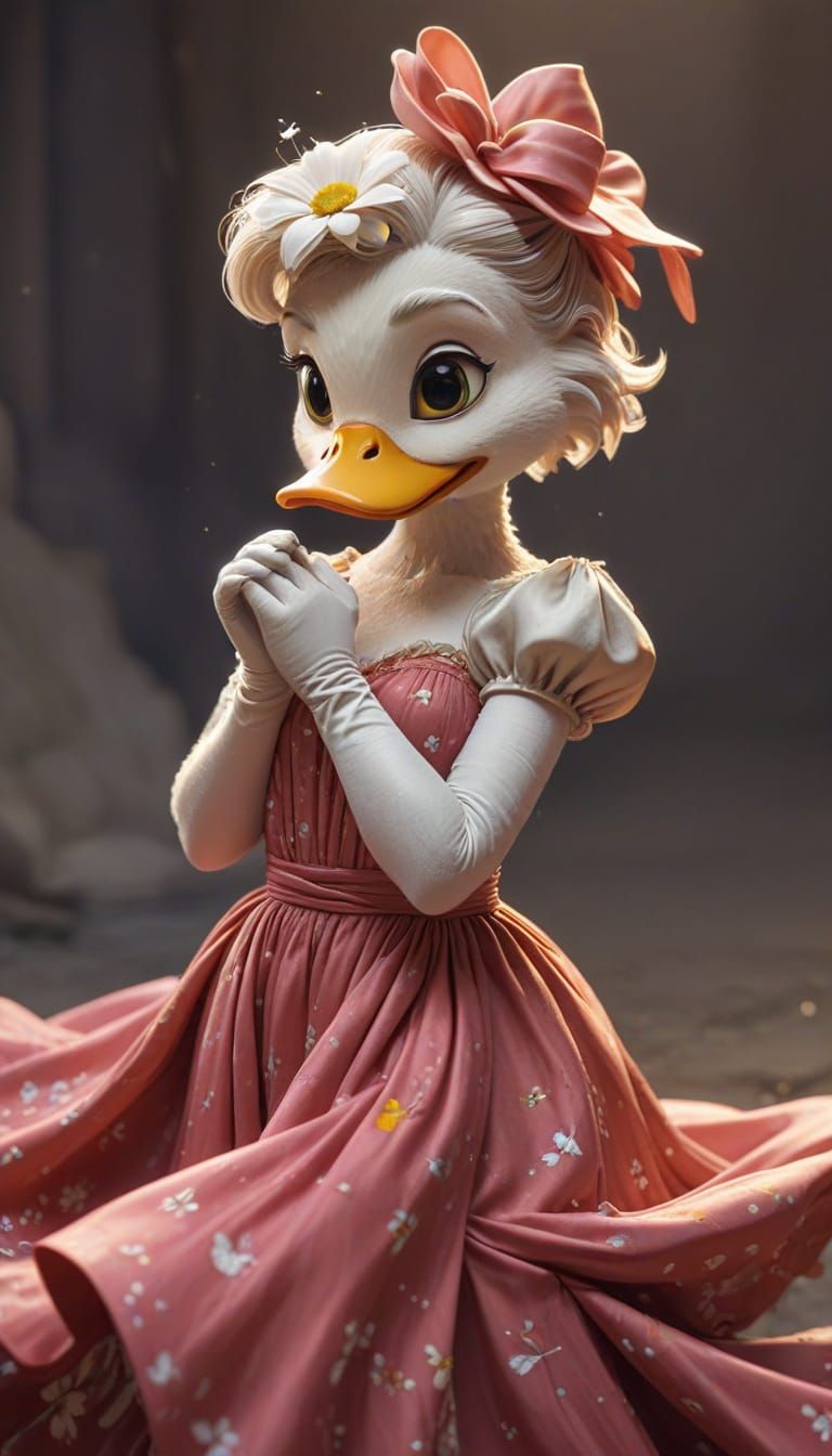 This image shows a hyper-realistic, medium shot illustration of an anthropomorphic duck woman in a nostalgic, Disney-inspired style. She is holding her dress with both hands as if dancing.