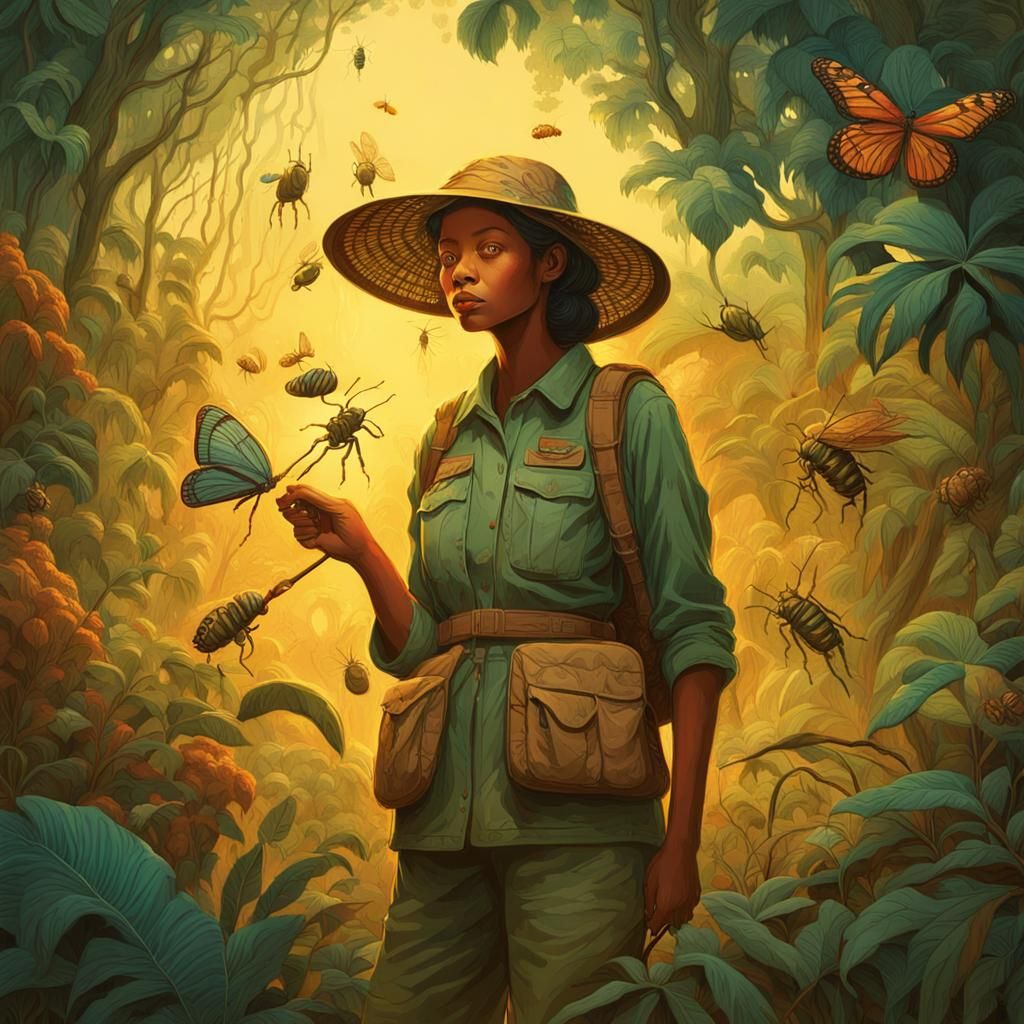A vibrant storybook-style illustration of a woman on safari in a lush jungle, surrounded by insects. The image features exaggerated foliage, detailed textures, and golden hour lighting, with a vintage, surreal aesthetic.