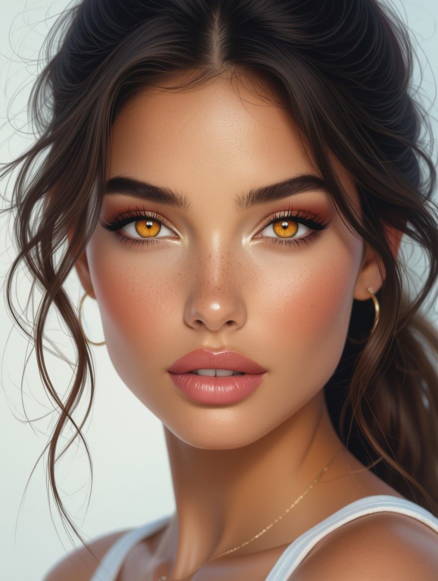 This image showcases a hyperrealistic portrait of a woman with deeply tanned skin and vibrant orange eyes, set against a colorful background and captured in a dramatic, 2/3 face angle with side light.