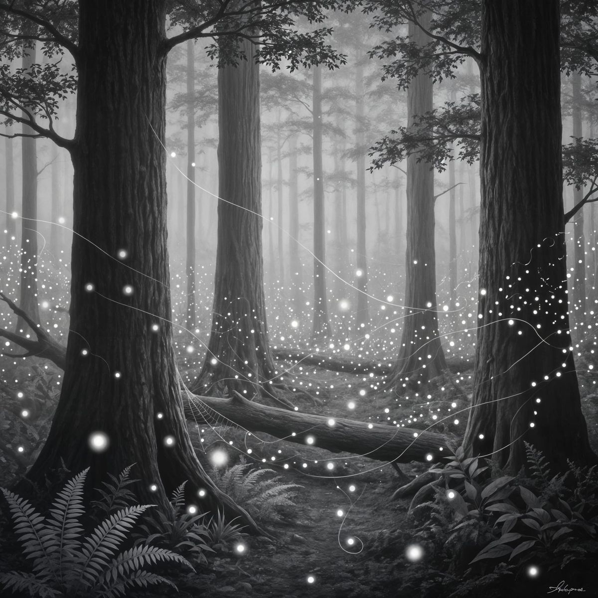 This ethereal monochrome painting depicts hundreds of fireflies creating intricate light trails throughout a dense, ancient forest in shades of grey, from pure white to absolute black.