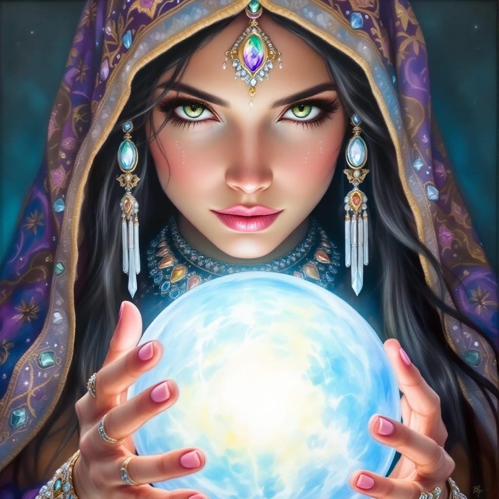 A detailed, close-up portrait of a mystical female fortune teller, painted in a fantasy art style with thick, textured brushstrokes, set against a neutral background.
