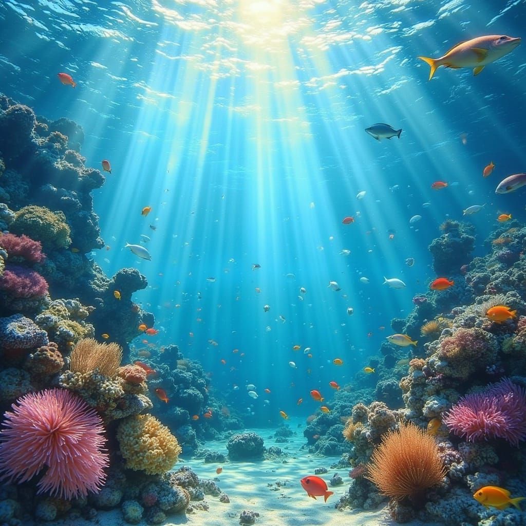 This image shows a vibrant underwater city scene with colorful coral reefs and fish, illuminated by sunlight filtering through the water in a detailed digital art style.