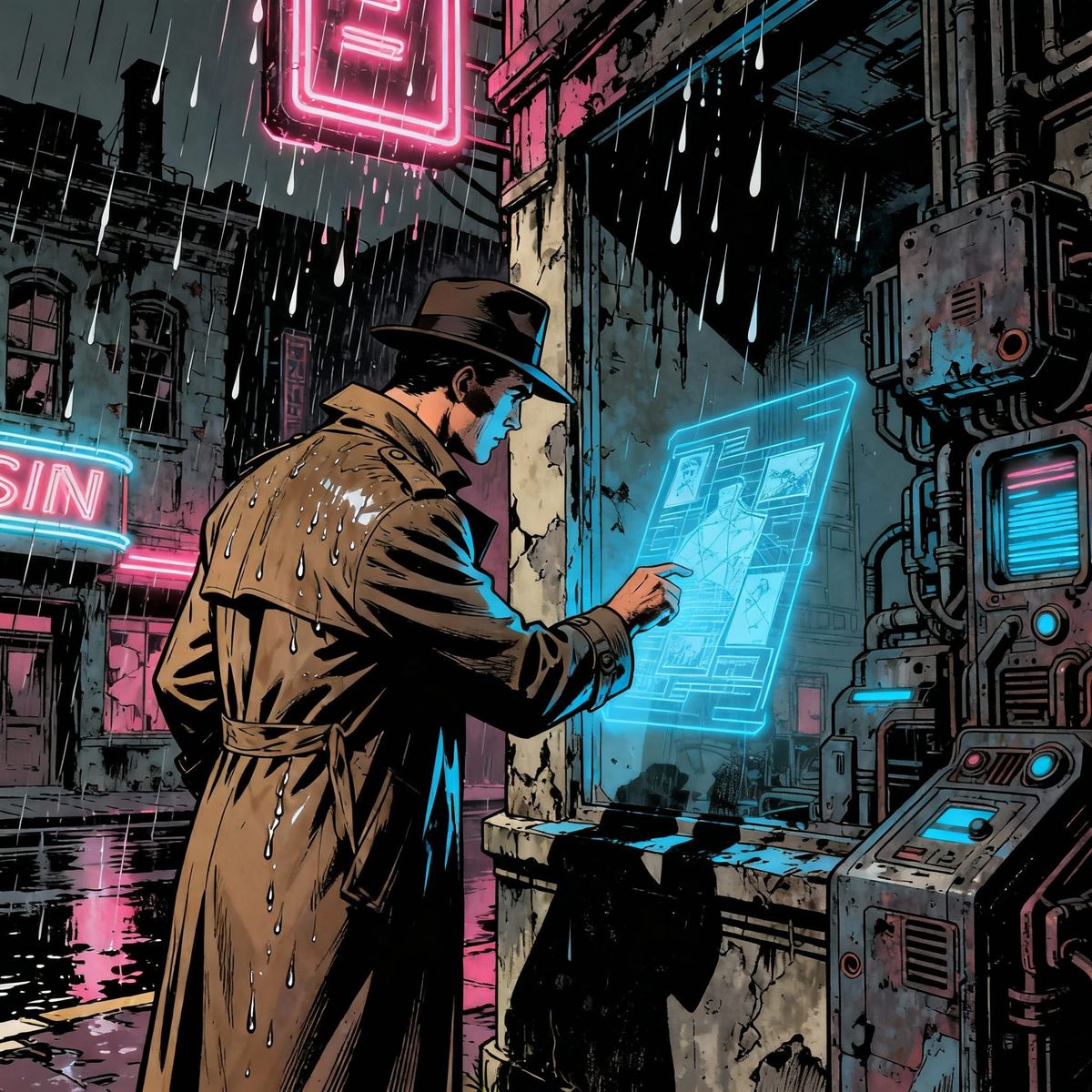 This image shows a vintage detective investigating a holographic clue on a wet, neon-lit street. The scene blends 1940s noir with retro-futuristic decay, presented as a gritty comic book panel with bold inks.