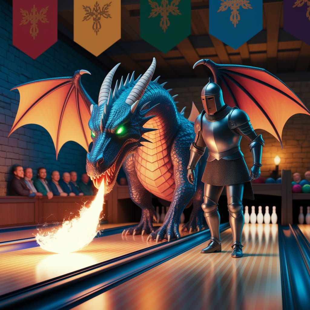 This image shows a dragon and a knight at a medieval bowling tournament. The dragon's fiery breath illuminates the wooden lanes, stone walls, and colorful banners in the warm, fantastical scene.