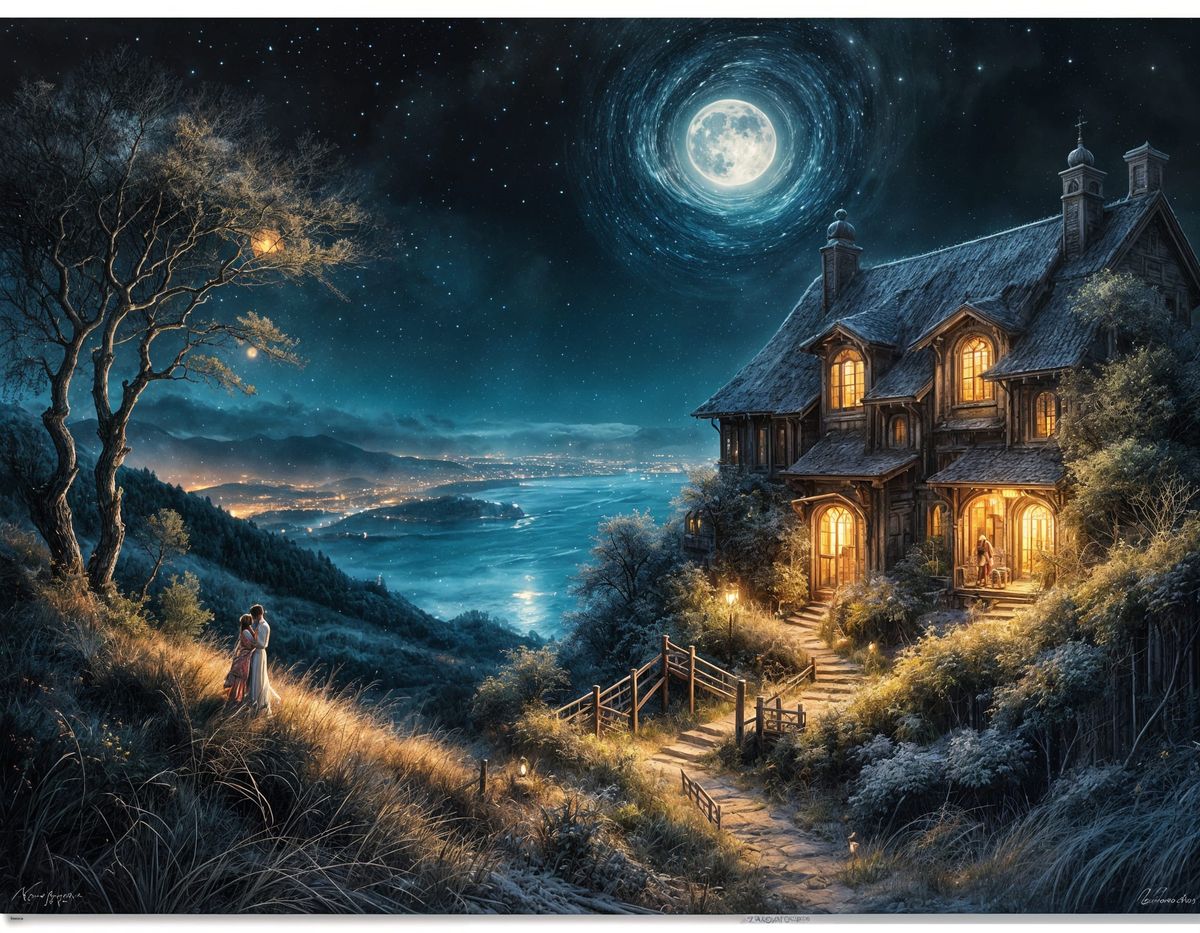 A breathtaking digital artwork depicting a stunning summer night landscape with intricate details, flickering lights, and a loving couple under a full moon, amidst a cinematic and maximalist atmosphere with godrays and snowflakes.