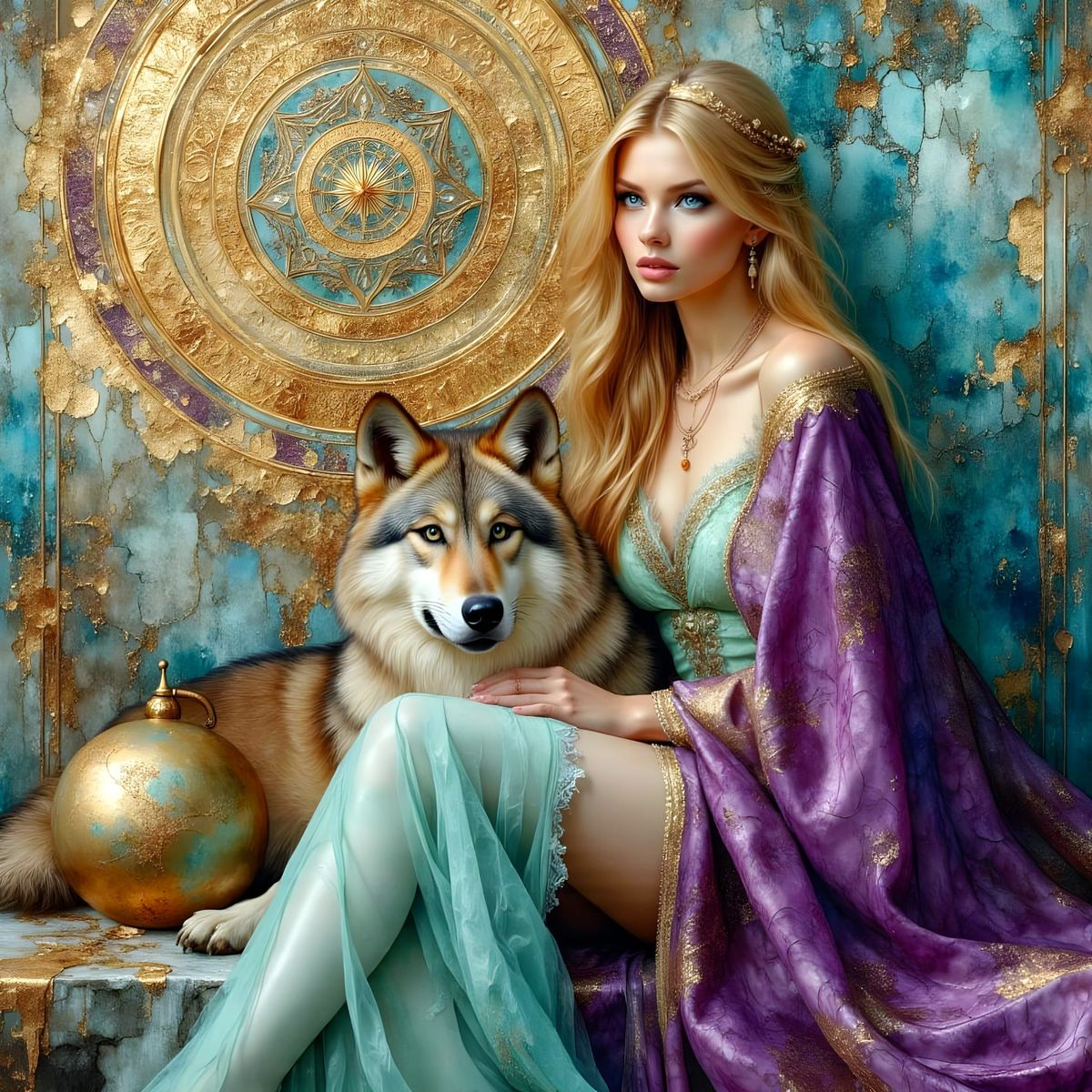 A striking picture of a sensual woman with a wolf companion. The image is a photorealistic oil painting with intricate details, in a fantasy aesthetic with vibrant colors and textures.