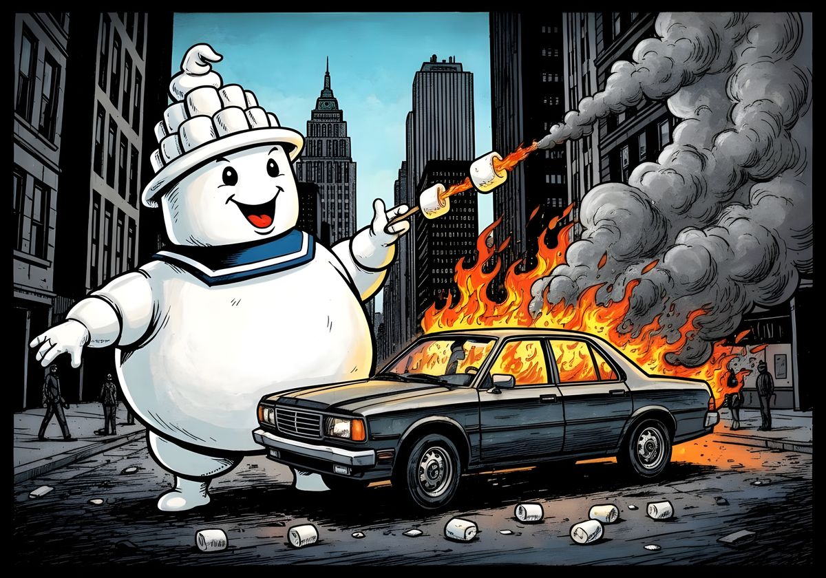A pop art comic style image of the Marshmallow Man cooking a marshmallow over a burning car in New York City, featuring bold black ink and heavy brushstrokes.