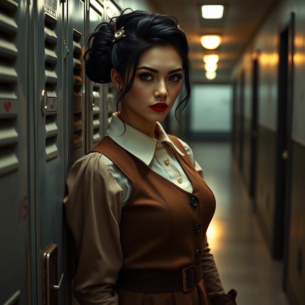 This image features a young woman with porcelain skin and striking features, adorned with steampunk-inspired accessories, standing in a dimly lit school hallway. The Victorian-era-inspired school uniform and cinematic lighting evoke a sense of elegance and rebellion, with a distinct post-processed aesthe...