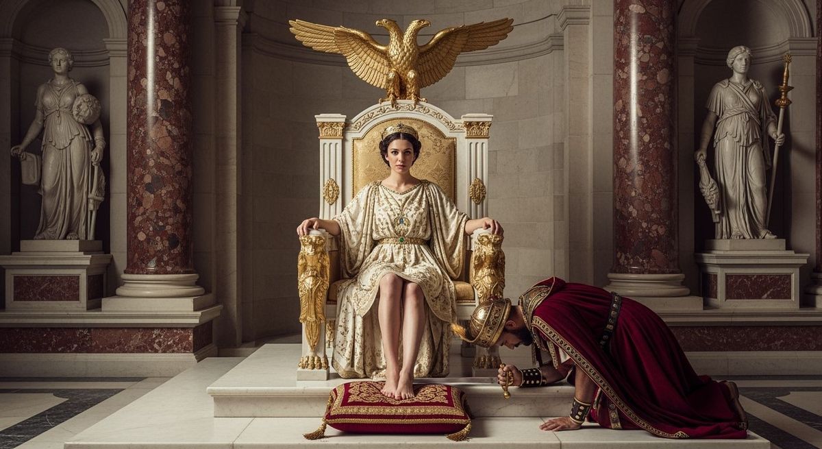 This image depicts Empress Messalina on a marble and gold throne, receiving a surrendered sword from a kneeling king. The throne room is captured in a hyperrealistic photography style.