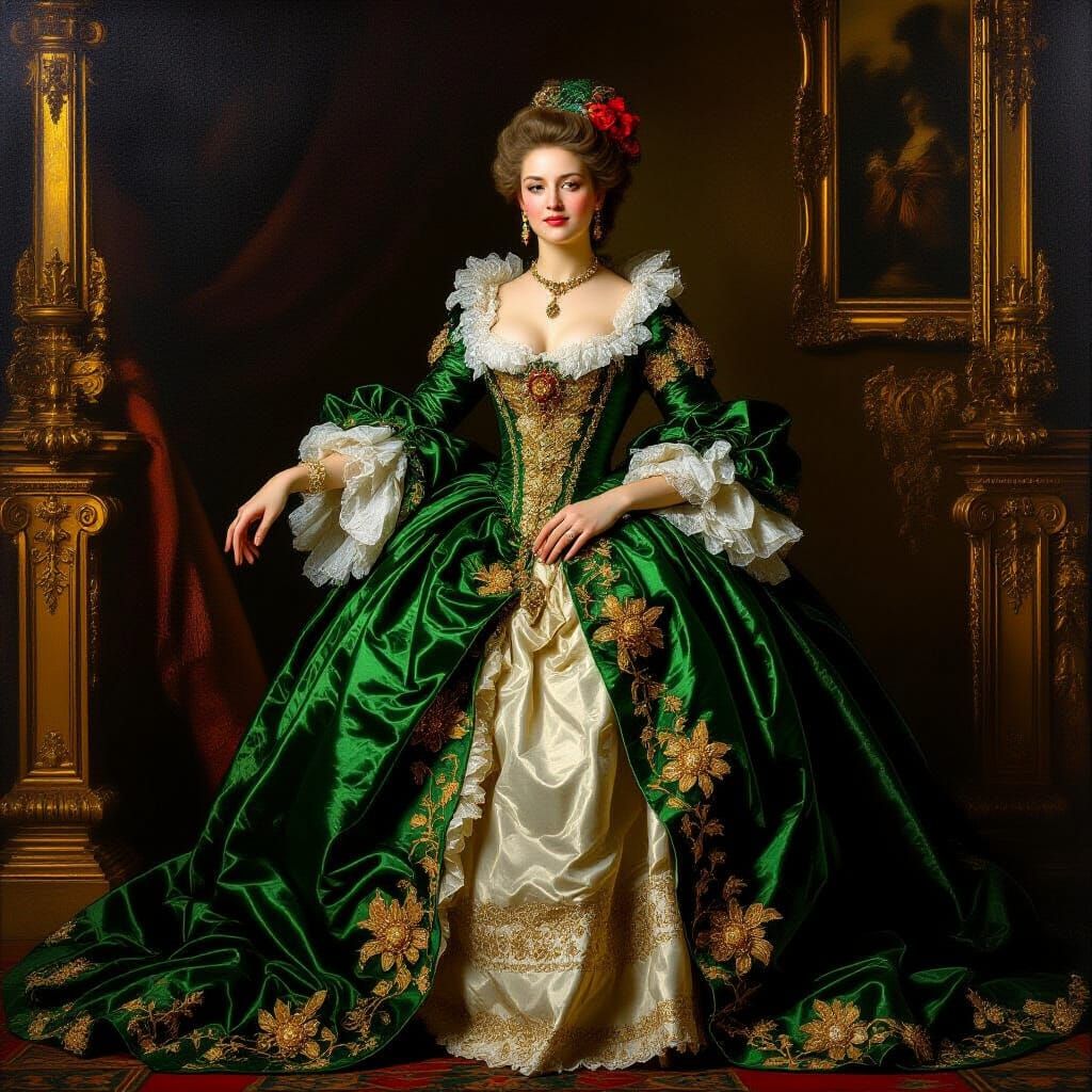 This image shows a woman in a luxurious green baroque gown with golden embellishments, set in an elaborate 18th-century scene. The artwork evokes a dramatic, ornamented baroque painting style.