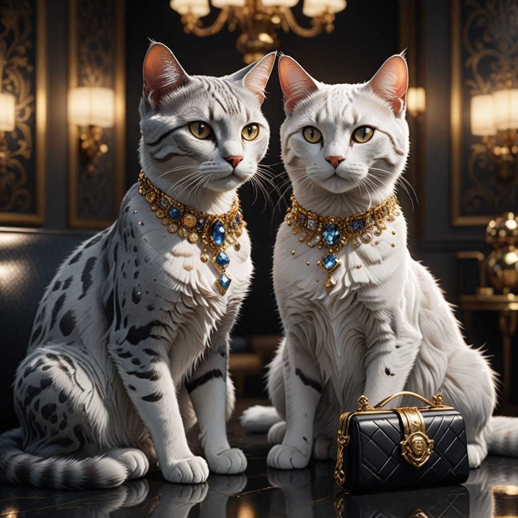 This image showcases two refined felines receiving high-end nail treatment in a modern salon. Adorned with designer jewelry and accessories, they embody feline sophistication and luxury.
