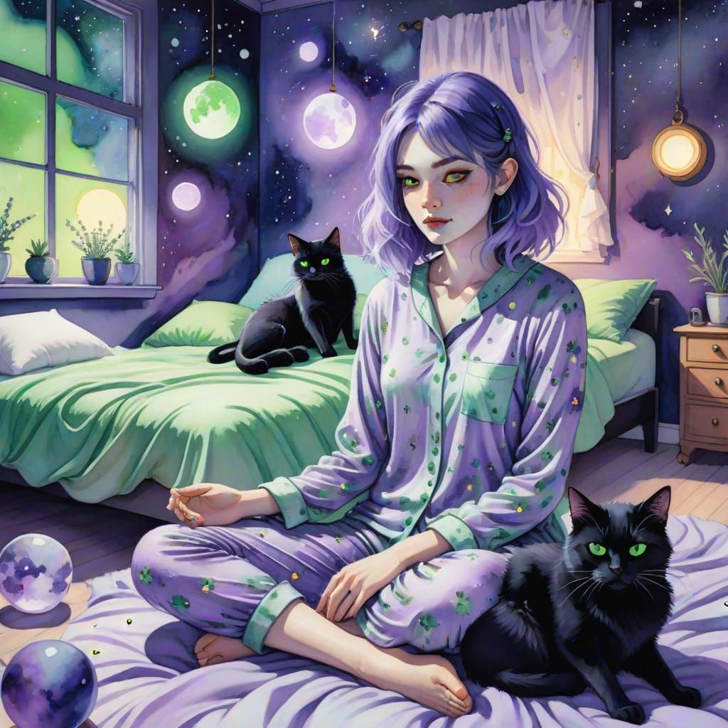 whimsical illustration of a young woman with flowing lavender and indigo hair, wearing celestial print pajamas, sitting cross-legged on a bed. A fluffy black cat with luminous green eyes rests beside her. The background features a cosmic themed room with soft, glowing orbs. Watercolor effect, high detail, ...