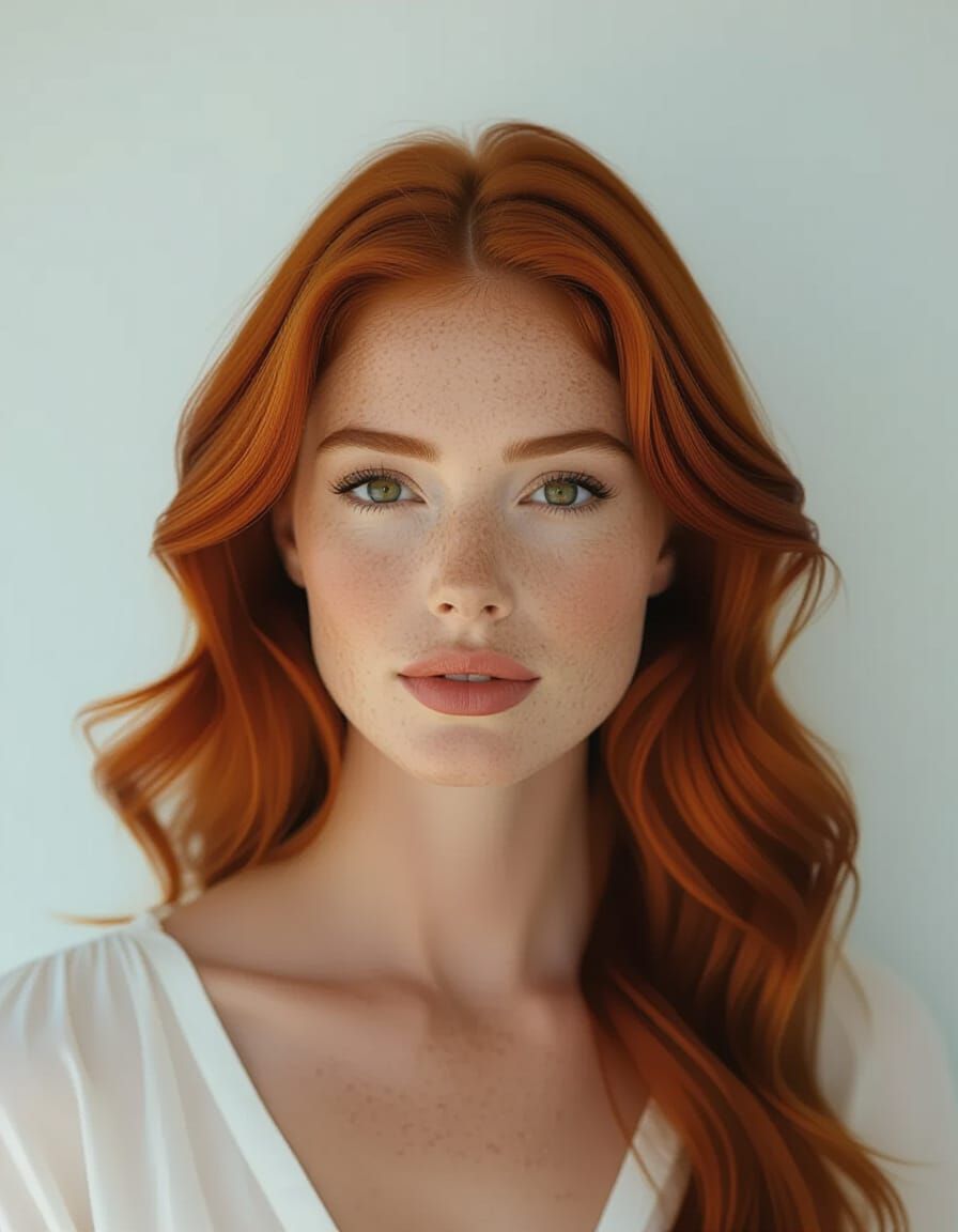 A striking picture of a beautiful woman with red hair and brown eyes. Her skin glistens with tiny droplets, captured in cinematic detail with rich film grain and atmospheric lighting.