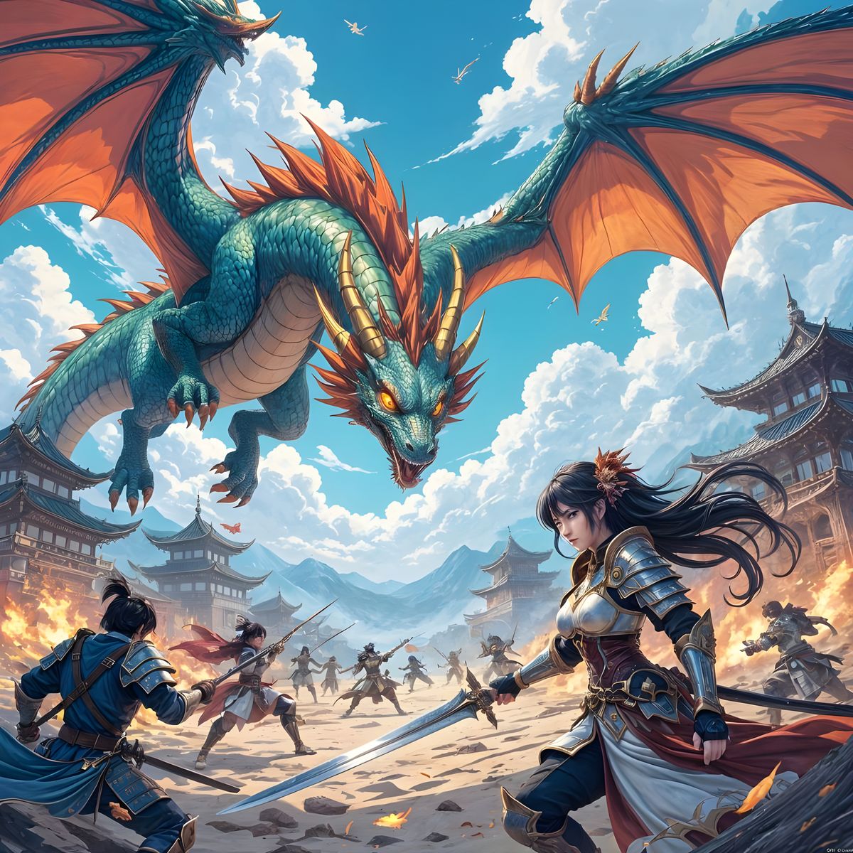 A hyperdetailed anime scene featuring a female warrior and a shimmering dragon against a chaotic battlefield, rendered with bold outlines and cinematic lighting in a cel-shaded style.