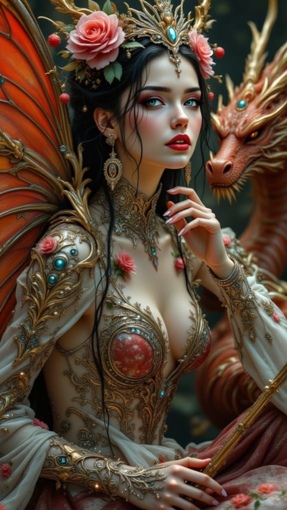 This image shows a cyborg geisha in a red floral dress seated on a mechanical throne, holding a dragon. The artwork evokes Pre-Raphaelite aesthetics with intricate details.