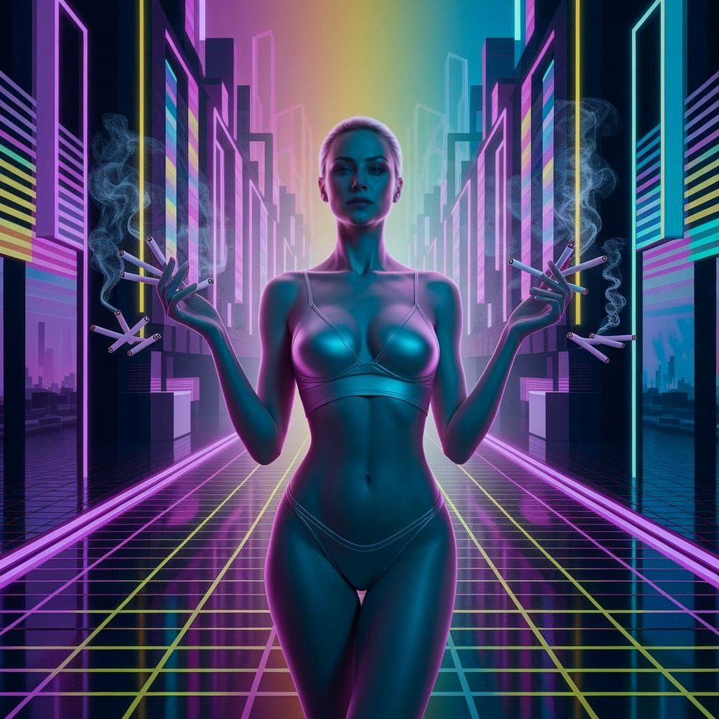 This image shows a woman standing in a vibrant cyberpunk cityscape, surrounded by intricate geometric patterns and neon lights, with multiple cigarettes emitting soft glows in her hands.