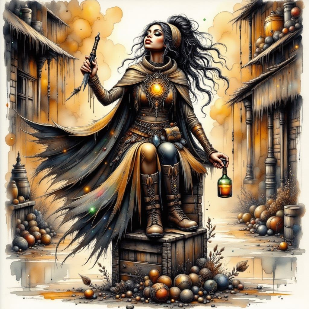 This image depicts a full-body ink drawing of a determined woman in a repurposed nun's habit, preaching with fierce passion in a gritty slum. Features dusty browns, faded reds, and golden crystal highlights.